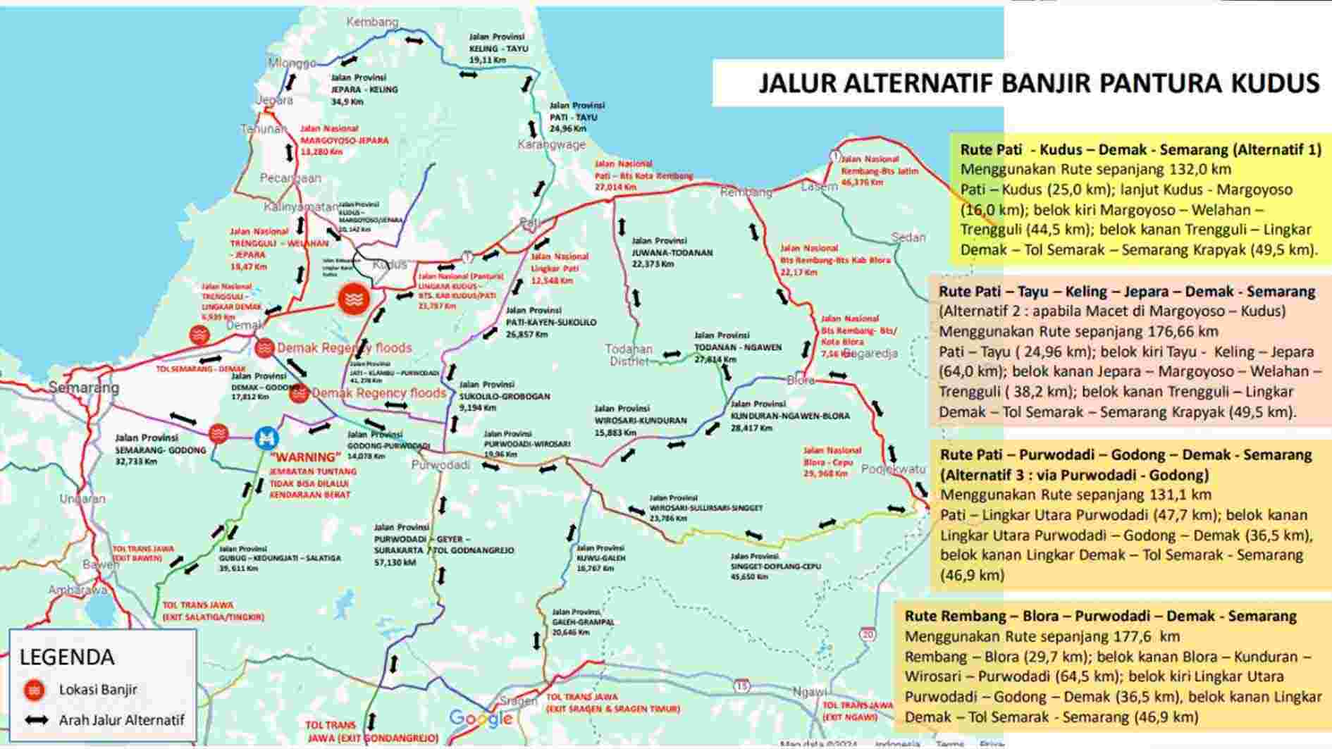 Untuk mengatasi kemacetan, Pemerintah Provinsi Jawa Tengah bersama Polda Jateng telah menyiapkan jalur alternatif bagi pengguna jalan di ruas Pantura. Hingga saat ini, jalur Pantura di wilayah Karanganyar (Demak) masih tergenang air dengan ketinggian 1-1,5 meter.