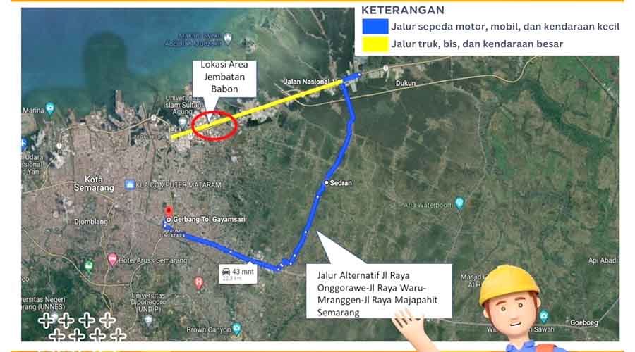 Ilustrasi jalur alternatif pengalihan arus selama pemeliharaan Jembatan Kali Babon Semarang. (istimewa/Instagram BBPJN Jateng-DIY)